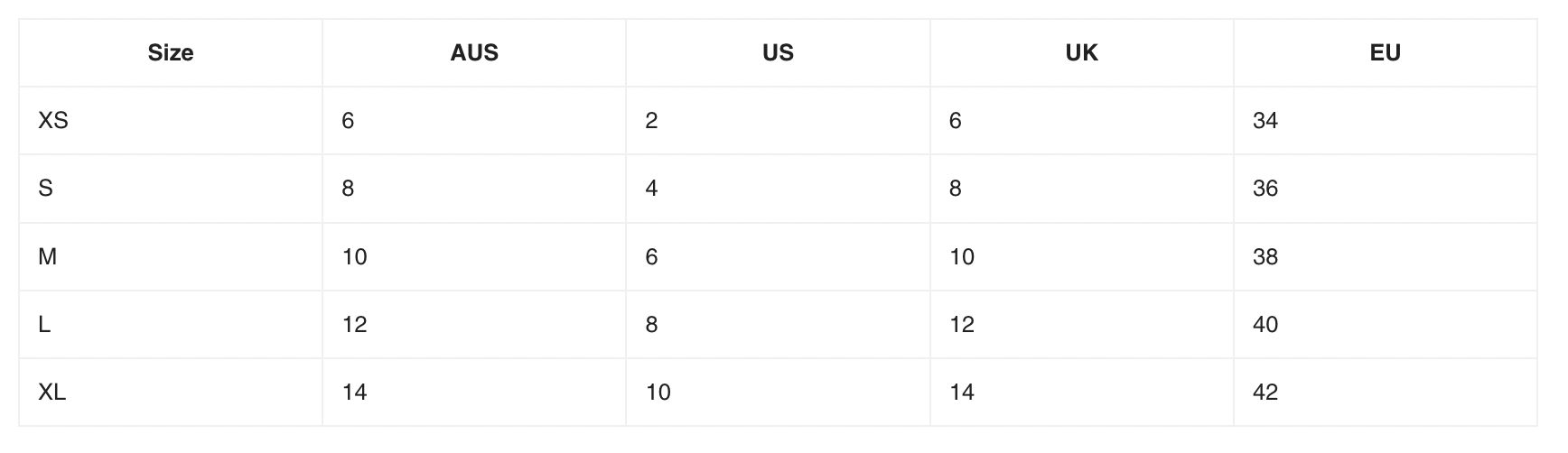 Please note that this size guide serves as a general guideline for helping you find your size. Exact measurements may vary with each style. Please check the sizing information and fit tab for the specific details to be noted on each item.